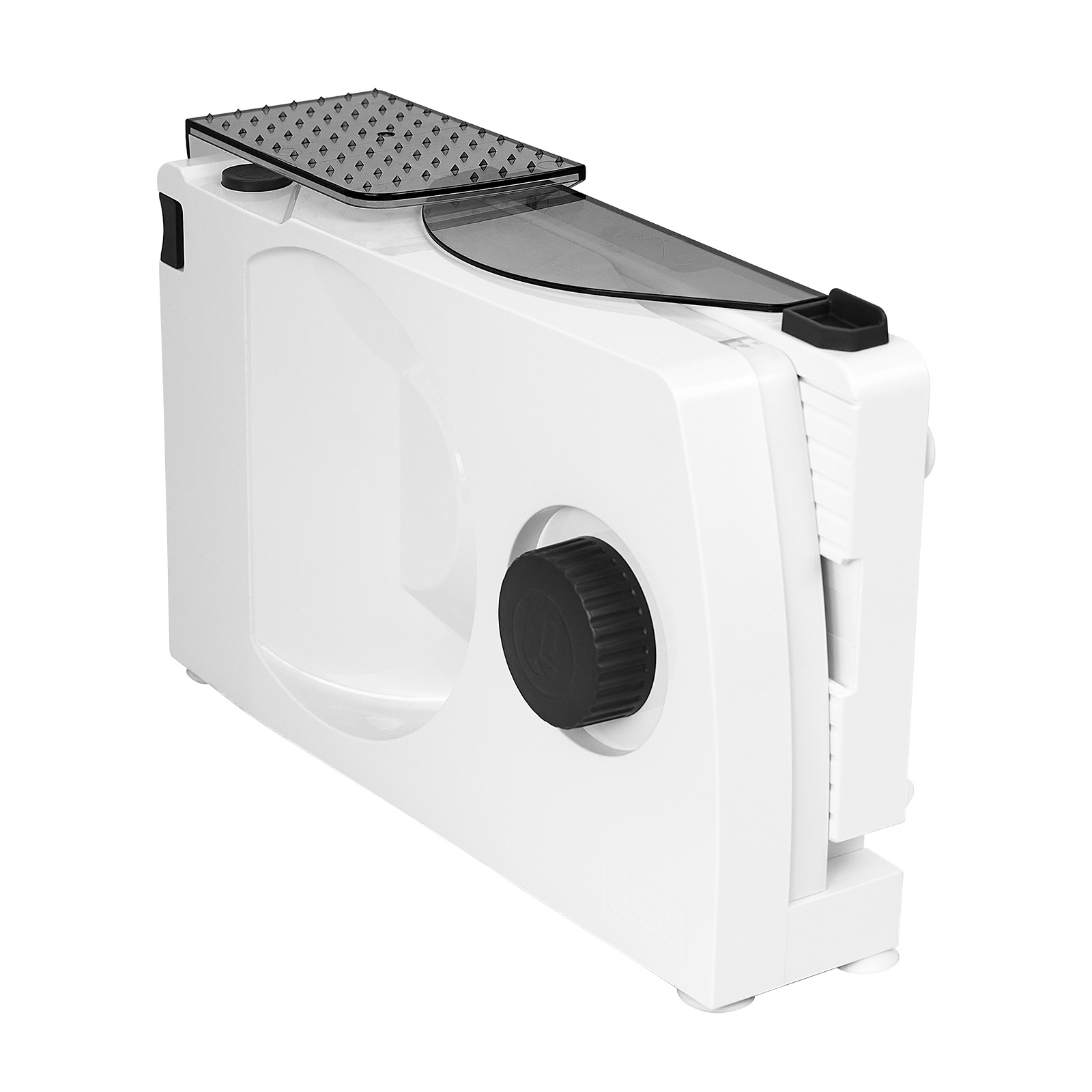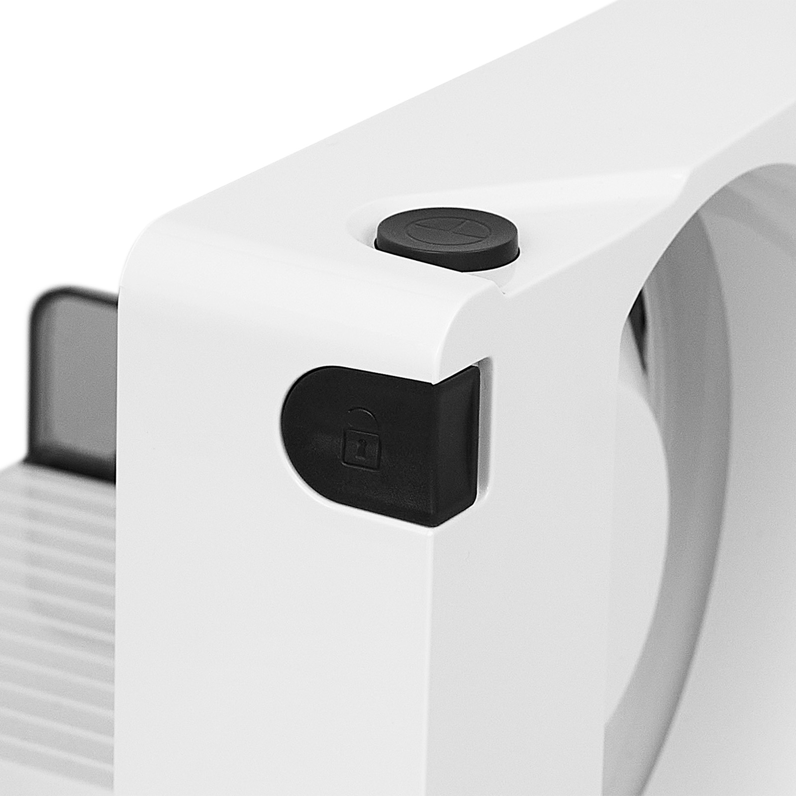 Ein Schlittenweg von rund 20 cm, die optimierte Schlittenführung sowie das 2-Finger-Einschaltsystem garantieren höchste Bedienfreundlichkeit und Sicherheit. Daumenschutz, Restehalter und Schlittenboden lassen sich kompakt direkt am Gerät verstauen – platzsparend und aufgeräumt.