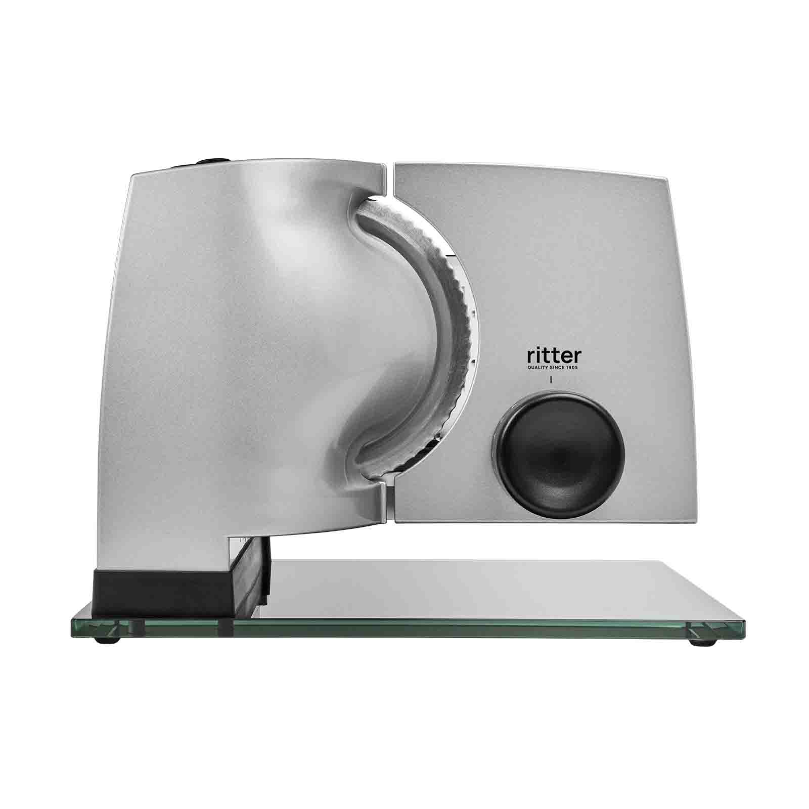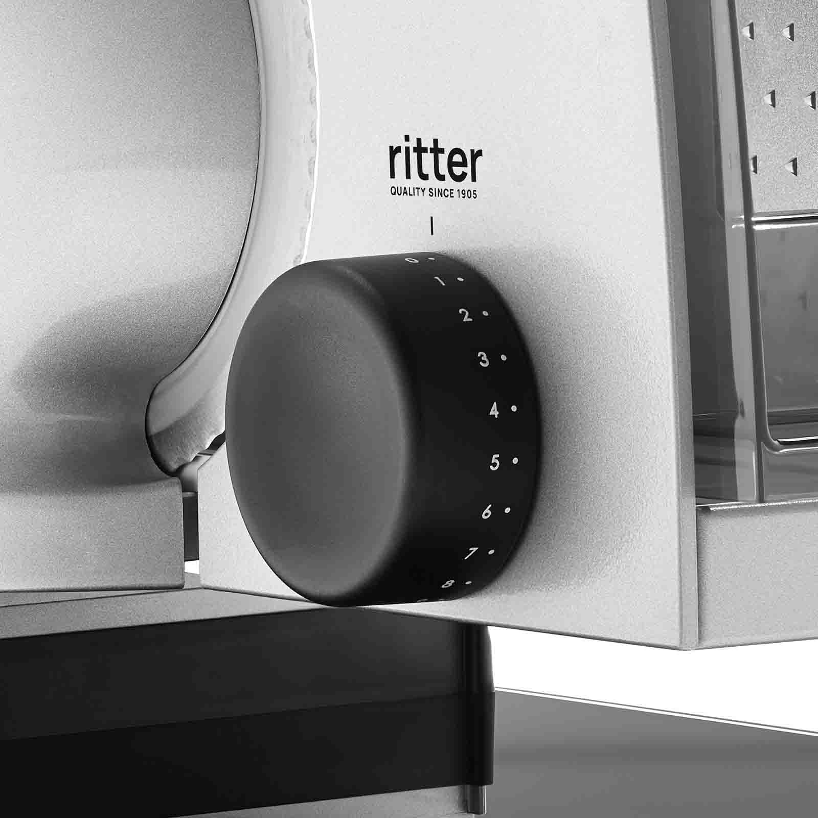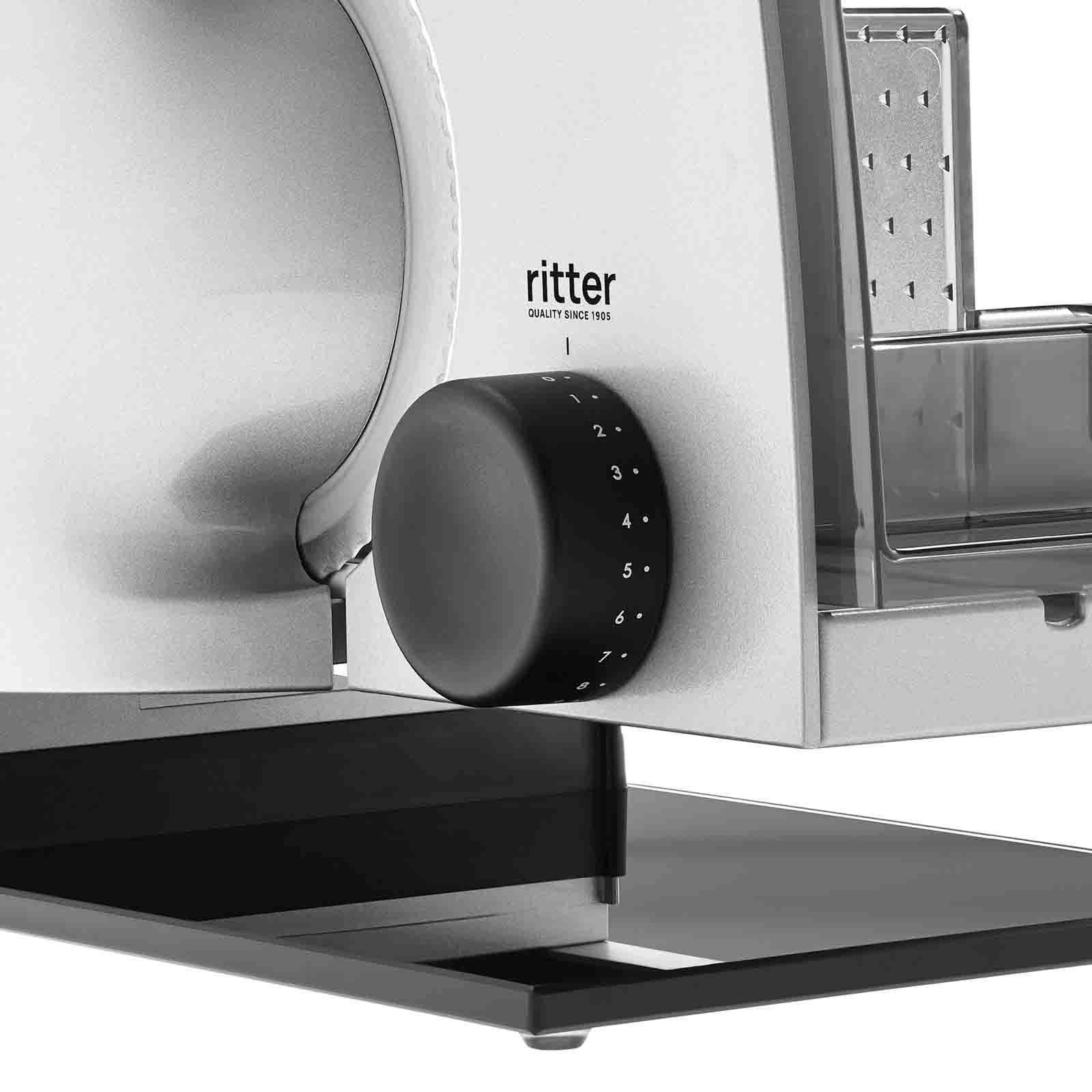 Die Schnittstärke kann stufenlos von hauchdünn bis ca. 20 mm eingestellt werden. Bei übergroßem Schneidgut kann der Schlitten abgenommen werden.