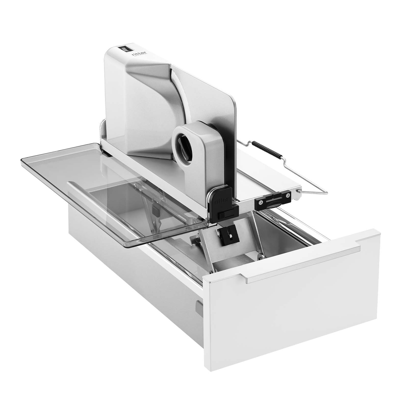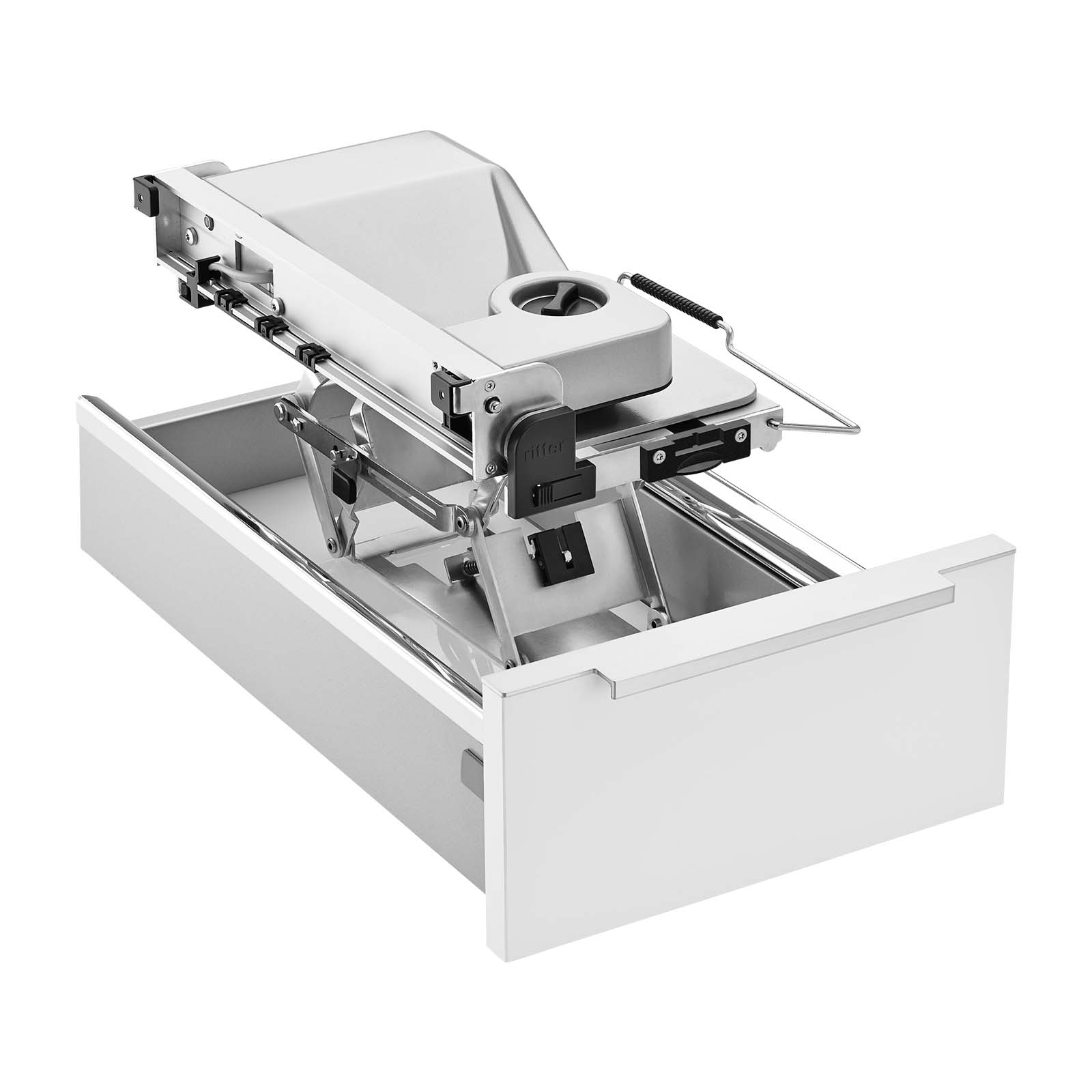 Die Schneidemaschine BFS 52 S ist besonders platzsparend und passt in jeden Normschubkasten ab 30 cm Korpusbreite – ideal für eine effiziente Raumnutzung in jeder Küche.