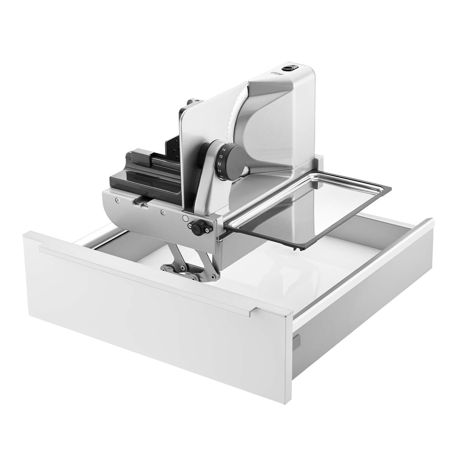 In Küchenschubladen eingebaute Allesschneider sind platzsparend und dabei doch immer griffbereit. Die Einbaulösung schafft zudem noch Platz auf der Arbeitsplatte.