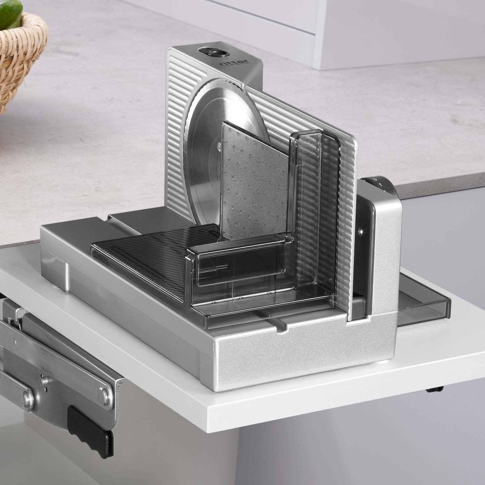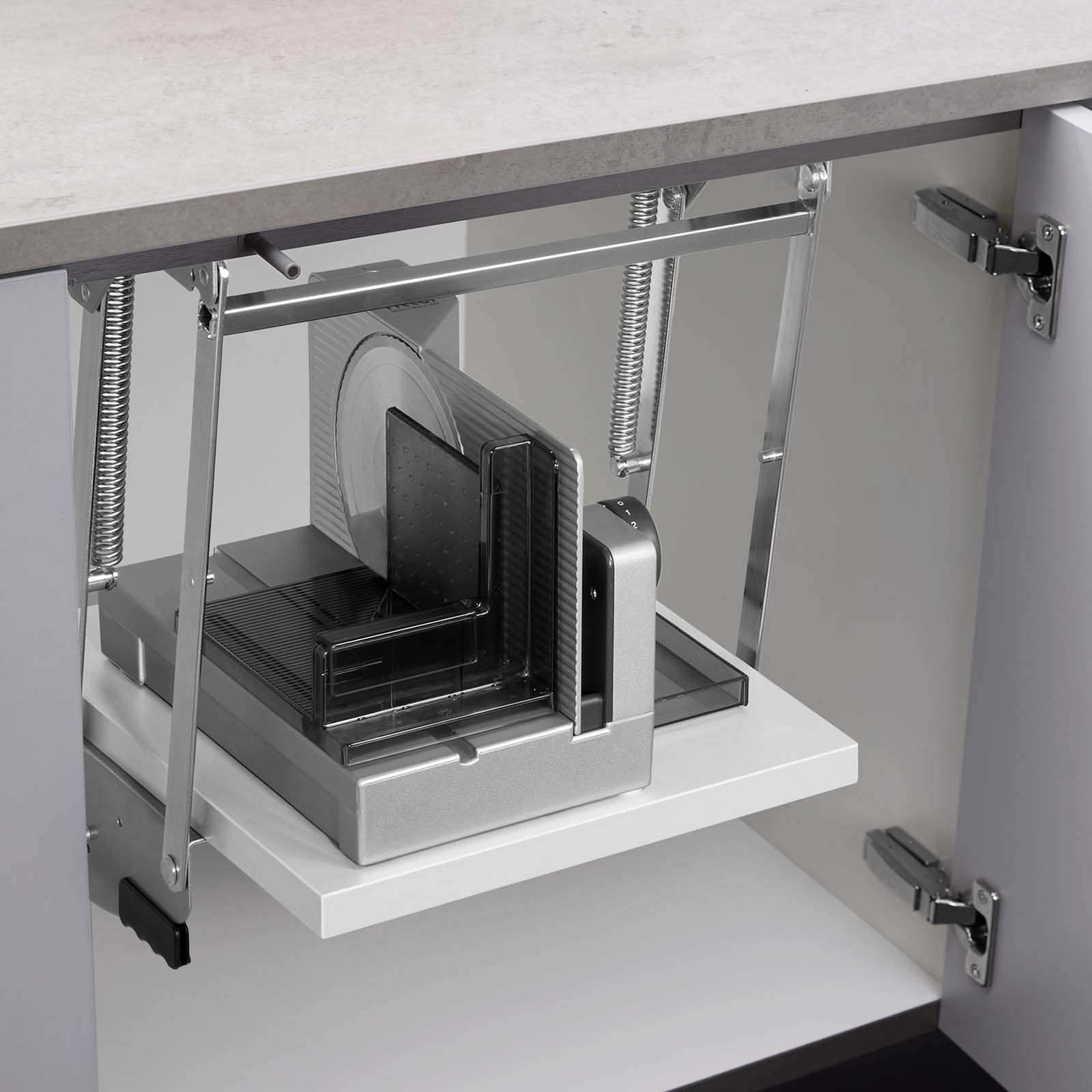 Die Montage des E 118 erfolgt auf einer Schwenkmechanik, die es ermöglicht, das Gerät bei Bedarf einfach nach oben zu ziehen. So steht der Allesschneider sofort griffbereit und in Funktion, während er nach dem Gebrauch platzsparend im Unterschrank verstaut werden kann. *Bitte beachten Sie, dass die Schwenkmechanik nicht im Lieferumfang enthalten ist.