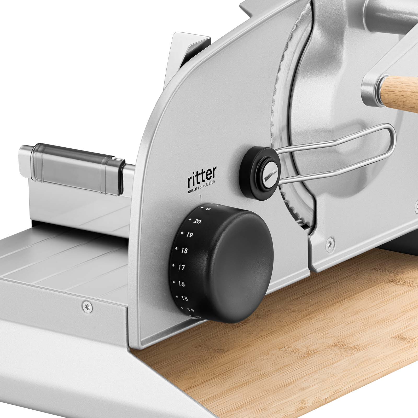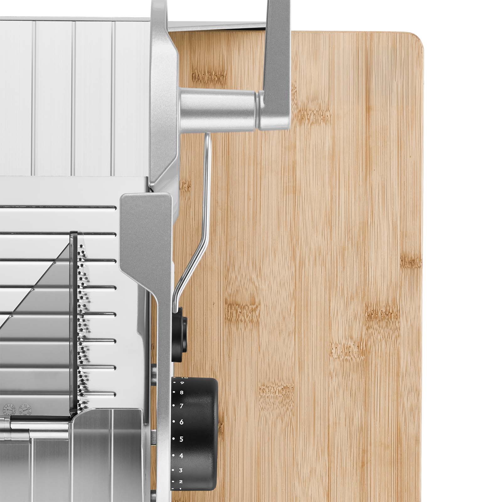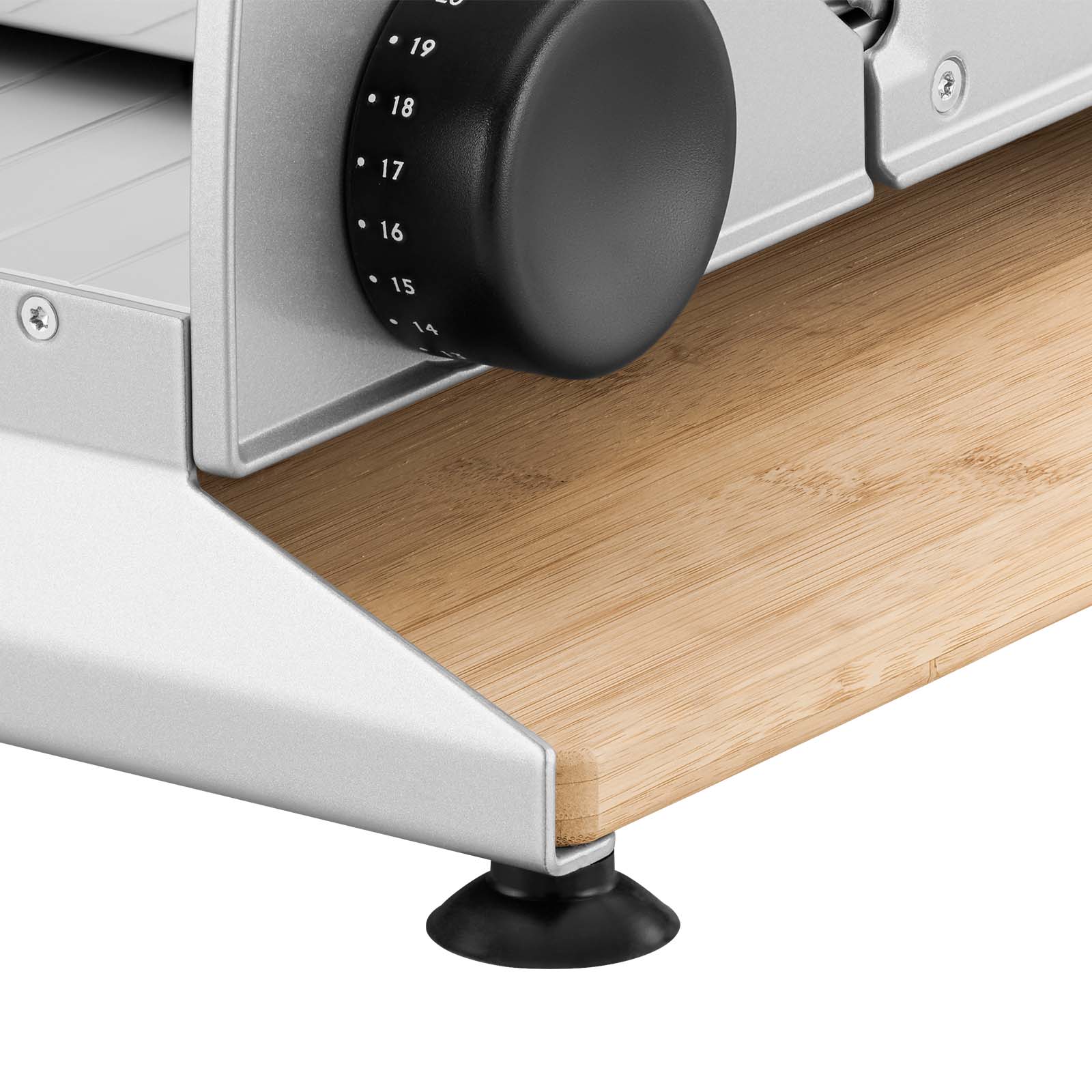 Die Schnittstärke kann stufenlos bis ca. 20 mm eingestellt werden und der Schneidgutschlitten aus rostfreiem Edelstahl kann problemlos und einfach abgenommen werden.