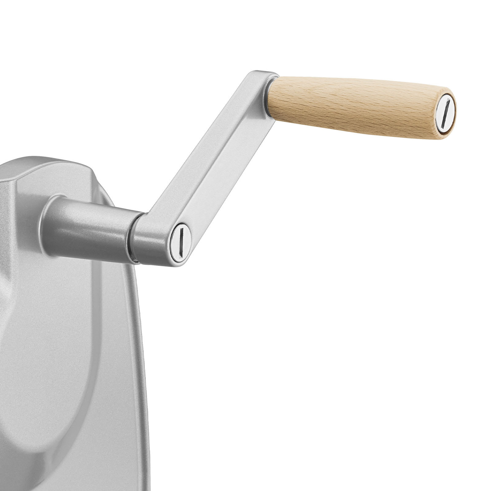 Betrieben wird er mit einer leichtgängigen Handkurbel mit einem besonders hochwertigen Griff aus Buchenholz und kommt daher ganz ohne Strom aus. Somit ist er überall und zu jeder Zeit einsetzbar. Für eine bessere Ausgabe von großem, hartem Schneidgut während des Schneidvorgangs, hat die piatto5 einen Schneidgut-Führungsbügel. Der Vorteil von diesem ist, dass das eben geschnittene Schneidgut den weiteren „Kurbelvorgang“ nicht stört bzw. blockiert. Das Schneidgut wird an der Kurbel vorbei geleitet und landet dann auf dem dafür vorgesehenen Bambusbrett. Dieses passt perfekt in die dafür vorgesehenen Schienen direkt unter dem Allesschneider, kann herausgezogen und als rustikale Servierplatte oder als Schneidbrett verwendet werden.