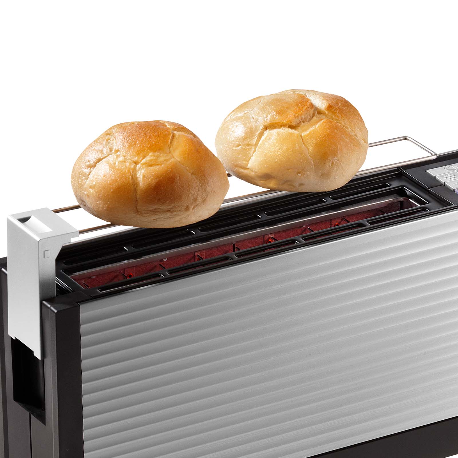 Einem gemütlichen Frühstück mit duftenden Semmeln oder Croissants steht mit der integrierten Brötchenauflage nichts mehr im Wege. Denn mit ihr können die Backwaren ganz einfach frisch und knusprig aufgebacken werden. Da die Brötchenauflage fest im Toaster integriert ist, muss sie nicht separat verstaut werden und kann somit nicht versehentlich verloren gehen. Sie ist also immer sofort einsatzbereit: einfach hochklappen, losrösten und Frühstück genießen.