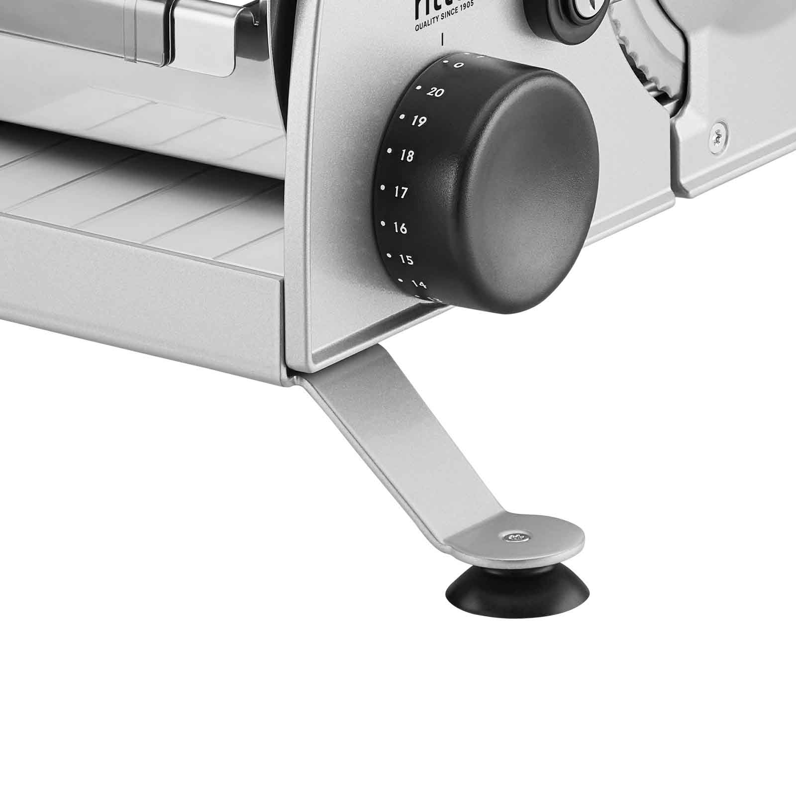 The slice thickness can be adjusted continuously up to approx. 20 mm and the stainless steel carriage can be removed easily and without any problems at all.